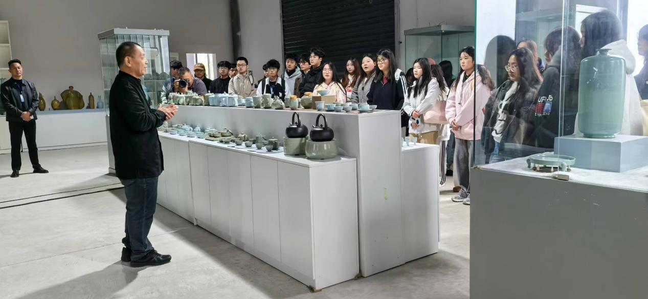 在文化园展厅内,范随州以“天青釉色”为切入点,系统阐释了汝瓷制作中繁复精微的七十二道古法工序。学生们通过对比传统素坯与釉下彩瓷片,深入理解纹样绘制、釉层覆盖与高温烧制间的相互作用,更从汝瓷作为国礼的现代创新作品中,读懂传统工艺如何通过设计转化实现当代复兴。
