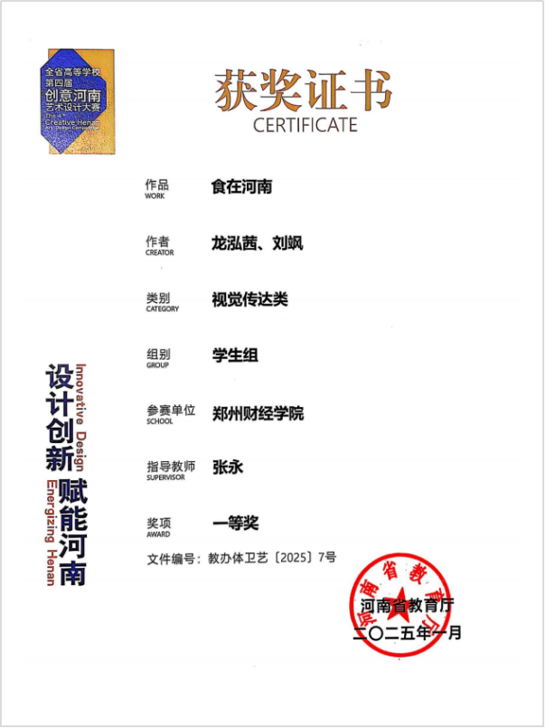 本次大赛吸引了全省多所高校的积极参与,参赛作品涵盖平面设计、环境设计、数字媒体艺术等多个专业领域。我院参赛作品《食在河南》、《豫见泥泥狗》均获得一等奖的好成绩,成为本次大赛的亮点之一。