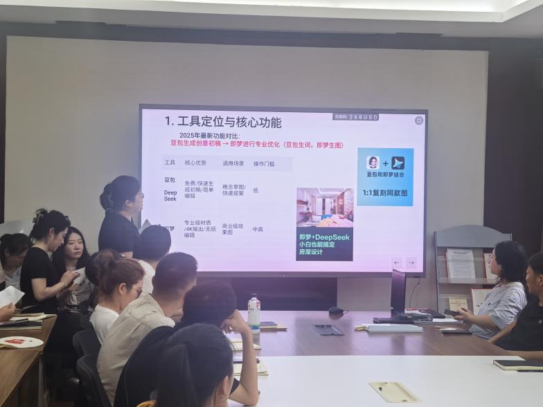 随后,五位教师从不同角度展示AI在设计与教学中的实践应用。孙雪老师以“AI在设计学院教学活动中的使用”为主题,介绍其在课程设计、创意启发等方面的应用案例,展现AI提升教学效率与学生参与感的作用;任鑫老师聚焦“数字影像创作”,讲解AI在图像生成、风格迁移、视频剪辑等环节的技术实现与艺术表现,为数字媒体艺术专业提供新创作思路;朱梦瑶老师以“人工智能与环境设计”为切入点,分享AI在空间分析、方案生成等方面的辅助作用,体现科技与人文结合的设计理念;杨涵老师以“历史经典到现代设计的转变与重构”为题,探讨借助AI工具对传统元素智能分析与再创造,实现文化传承与当代设计有机融合;刘海姣老师现场演示“豆包 + 即梦AI极速生成室内外效果图”操作,展现AI在快速方案表达与设计推演中的高效能力,为环境设计与建筑表现提供新技术路径。