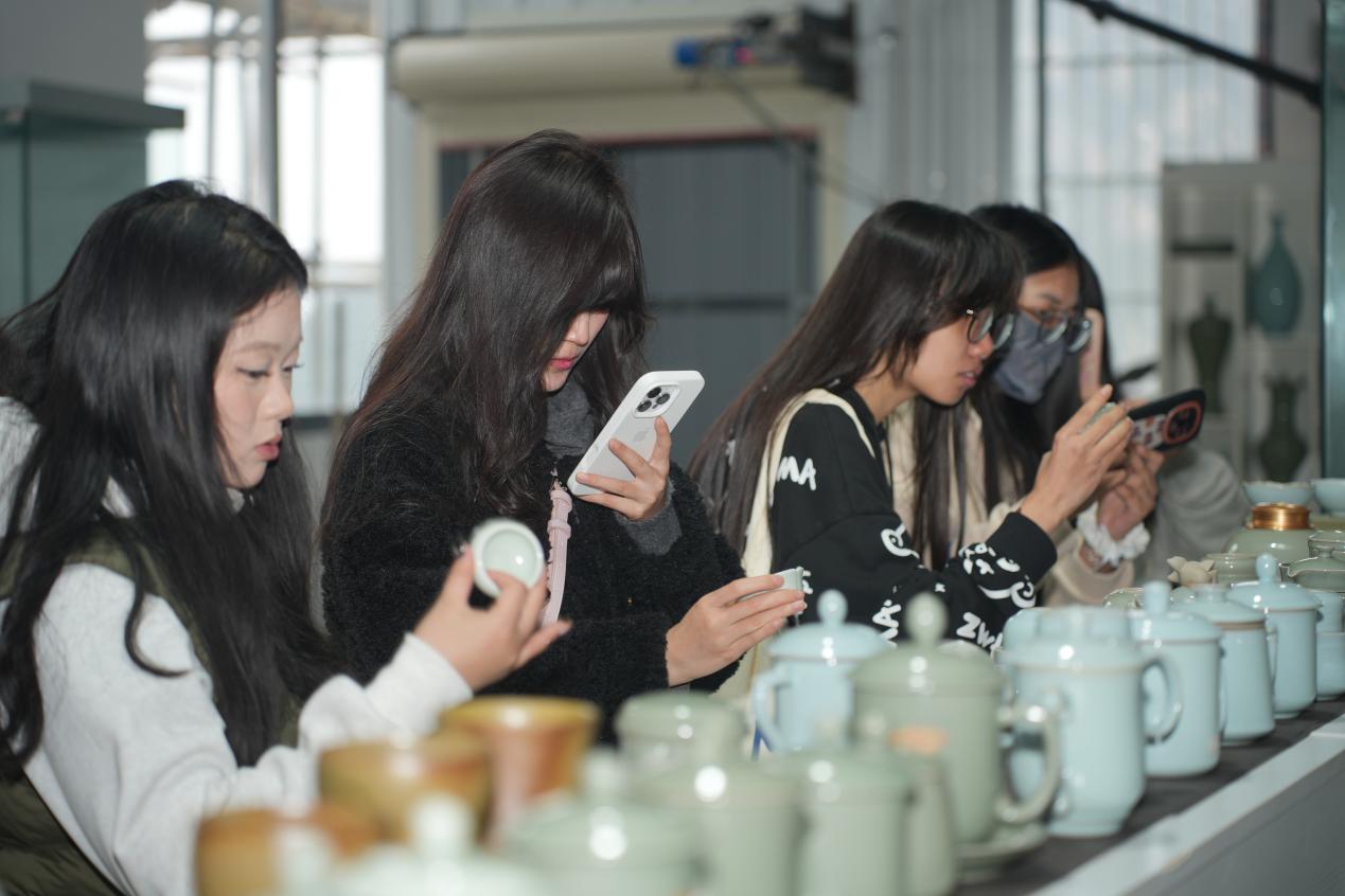 在文化园展厅内,范随州以“天青釉色”为切入点,系统阐释了汝瓷制作中繁复精微的七十二道古法工序。学生们通过对比传统素坯与釉下彩瓷片,深入理解纹样绘制、釉层覆盖与高温烧制间的相互作用,更从汝瓷作为国礼的现代创新作品中,读懂传统工艺如何通过设计转化实现当代复兴。